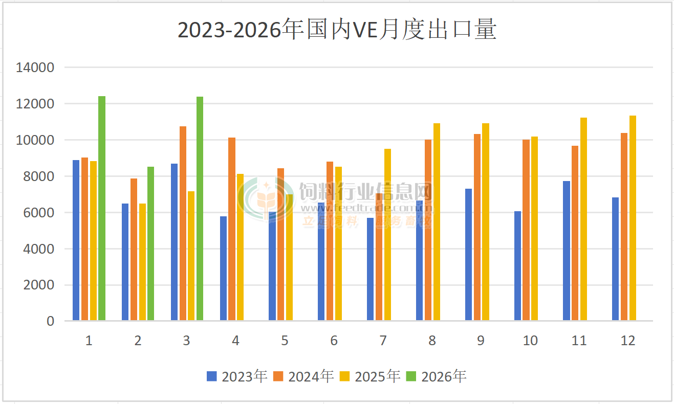 據海關數據統計,2026年1月我國維生素E出口量12409.4噸,2月我國維生素E出口量8527.66噸,3月我國維生素E出口量12381.682噸,同比增72.5%。2026年1-2月我國維生素E出口量20937噸,同比增37%。2026年1-3月國內VE產品進口量為825.435噸,同比增63.3%。國內VE產品主要出口國有美國、德國、荷蘭、巴西、日本、越南等。
