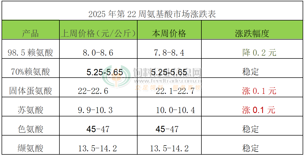 賴氨酸市場中,98%賴氨酸參考報價區間7.8-8.4元/公斤,70%賴氨酸參考報價區間5.25-5.65元/公斤。2025年4月,我國賴氨酸與賴氨酸鹽及酯的出口量為8.16萬噸,同比降5%。5月22日市場稱7-8月大成生化氨基酸計劃檢修1個月。5月28日伊品生物計劃7月寧夏基地檢修2周。本周成福70%賴氨酸停報。賴氨酸市場走勢分化,98%賴氨酸市場偏弱整理,70%賴氨酸市場穩中偏強。