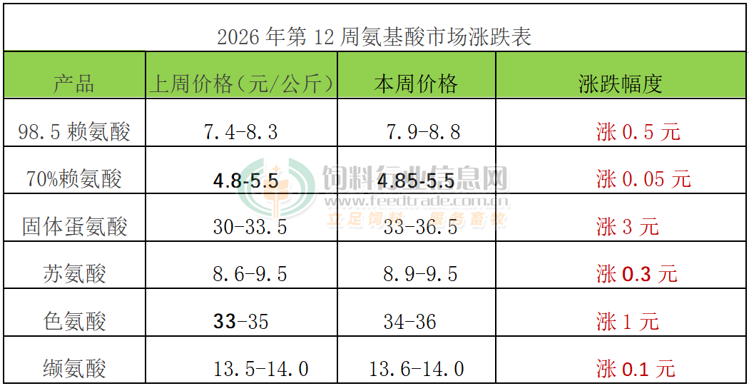 賴氨酸市場中,98%賴氨酸參考報價區間7.9-8.8元/公斤,70%賴氨酸參考報價區間4.8-5.5元/公斤。2025年12月,我國賴氨酸與賴氨酸鹽及酯的出口量為9.8萬噸,同比增0.4%,環比增8.4%。3月16日星湖伊品大品種氨基酸上調300-1000元/噸。3月18日市場稱金玉鋒98%賴氨酸報價8.5元/公斤,70%賴氨酸報價5.2元/公斤。因原料成本上漲且出口簽單較好,賴氨酸廠家挺價意愿偏強,市場價格重心上行。