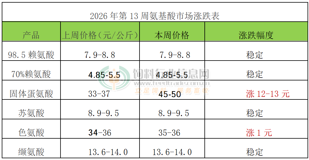 蘇氨酸市場動態,依據不同品牌不同貨量,市場報價8.9-9.5元/公斤。2026年1-2月國內蘇氨酸出口量11.8萬噸,同比增8%。梅花新工廠產能預計2026年3季度釋放,因成本上漲,3月9日星湖伊品大品種氨基酸上調200-1000元/噸。3月16日星湖伊品大品種氨基酸再度上調300-1000元/噸。本周廠家報價偏穩,蘇氨酸市場穩中整理。
