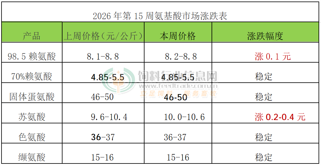 蘇氨酸市場動態,依據不同品牌不同貨量,市場報價10-10.6元/公斤。2026年1-2月國內蘇氨酸出口量11.8萬噸,同比增8%。4月8日星湖伊品蘇氨酸上調300元/噸,梅花生物蘇氨酸上調至10.5元/公斤。廠家挺價意愿偏強,蘇氨酸市場供應緊張,偏強運行。