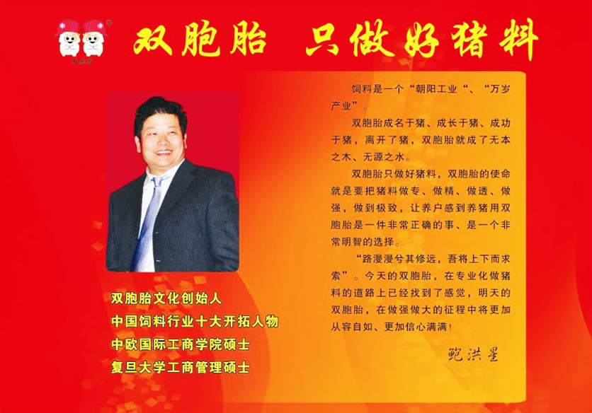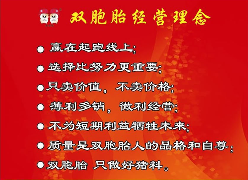 雙胞胎集團的成長、成功軌跡是中國民營企業發展之路的成功典范。2003年,創業初始的雙胞胎集團就立下“做中國豬飼料第一品牌”的遠大目標。創業者們棄當時盛行的傳統鴨料、雞料市場,毅然選擇了技術要求最高、突破難度最大的乳豬料市場,集中80%以上的資源配置到豬料研發上,歷經數以萬次的試驗,創立了跨時代產品“雙胞胎乳豬料”,并以此衍生雙胞胎品牌及其系列產品,開始了集團邁向中國豬料市場第一品牌的蹣跚起步、遠征之旅。