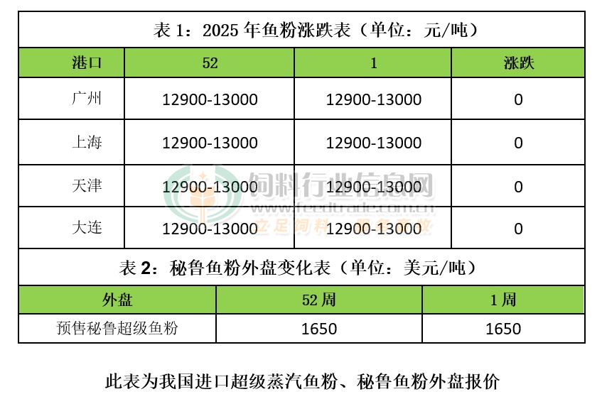本周外盤魚粉堅挺穩定,國內進口魚粉偏弱調整。外盤方面,當前秘魯魚粉廠商心態堅挺,報價不積極,秘魯超級蒸汽魚粉新季預售參考CNF1650美元/噸,穩定。據悉秘魯本季魚粉預售情況良好,繼續提振秘魯魚粉廠商心態。同時2025年上半年秘魯南部捕季將自1月1日起正式展開,至6月30日結束,捕魚配額數量為25.1萬噸