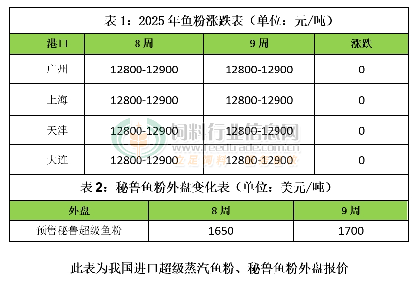 本周秘魯魚粉外盤漲價,近來秘魯新季魚粉預售成交在18萬噸左右,魚粉廠商心態繼續獲得提振,其中秘魯超級蒸汽魚粉新季預售參考CNF1700美元/噸,上漲50美元/噸,實際成交議價。捕魚方面,2025年1月1日-2月25日秘魯南部捕魚量共計108337噸,剩余配額數量為142663噸。值得注意的是,2月19日已經展開A季漁資源考察,對考察最終結果市場比較關注。