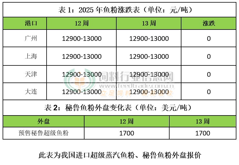 本周國內外魚粉價格持穩。外盤方面,秘魯超級蒸汽魚粉新季預售價格為CNF參考1700美元/噸,且周內成交一般,存在議價空間。當前秘魯新季預售量在19萬噸左右。業內人士關注漁資源考察動態,有人表示秘魯漁資源考察可能在4月上旬結束,開捕時間或晚于去年同期,值得關注。南部捕魚方面,2025年1月1日-3月25日秘魯南部捕魚量共計164672噸,剩余配額數量為86328噸。