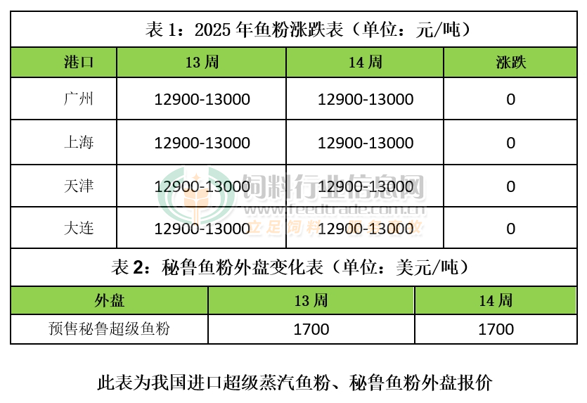 本周魚粉外盤穩定,而國內進口部分魚粉價格降價。外盤方面,秘魯超級蒸汽魚粉新季預售價格為CNF參考1700美元/噸,成交議價,當前秘魯新季預售量在20萬噸左右。進入4月份,市場有消息稱漁資源考察有可能在4月中上旬結束,開捕時間或在4月中下旬或5月上旬左右。南部捕魚方面,2025年1月1日-3月31日秘魯南部捕魚量共計174343噸,剩余配額數量為76657噸。