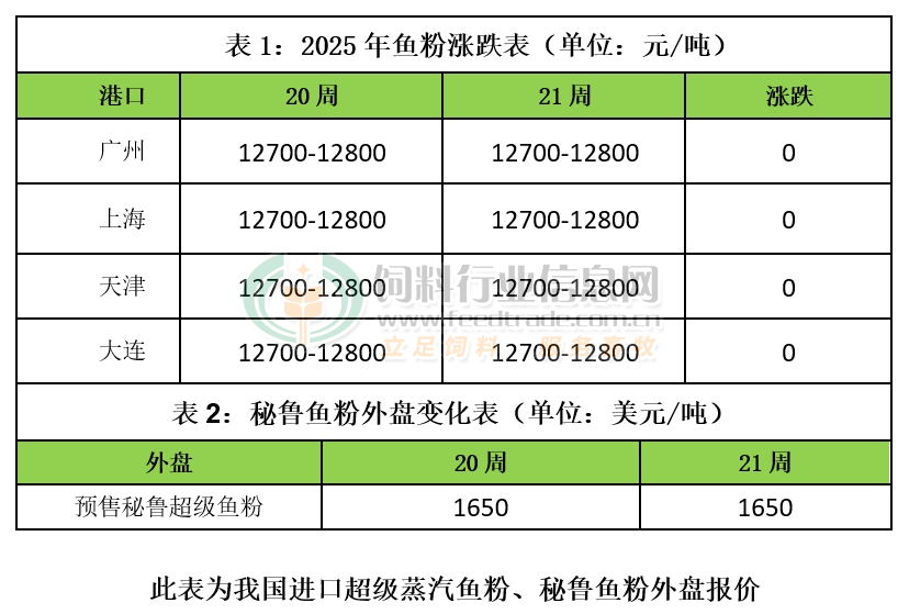 本周國內外魚粉保持弱勢,特別是進口普通級魚粉。外盤方面,當地市場買家存在壓價詢購現象,外盤價格偏弱,秘魯超級蒸汽魚粉本季預售價格為CNF參考1650美元/噸,成交議價。捕魚方面,2025年4月22日-5月17日秘魯中北部捕魚量共計1383856噸,配額完成46.13%。 同時有其他機構統計,配額已經完成過半,中北部捕魚配額有望在6月中下旬完成。