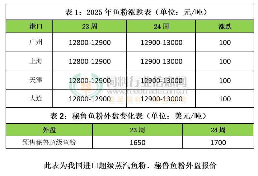 本周魚粉外盤價格上調。秘魯超級蒸汽魚粉本季預售報價CNF參考1700美元/噸,上調50美元/噸,實際成交議價。據悉本季魚粉預售量達到了50萬噸以上,占可生產魚粉總量的七成;此外,秘魯沿岸風浪再度影響捕魚量,提振秘魯魚粉廠商心態。捕魚數據來看,2025年4月22日-6月10日秘魯中北部捕魚量共計2020131噸,剩余配額為979869噸,配額完成67.34%。