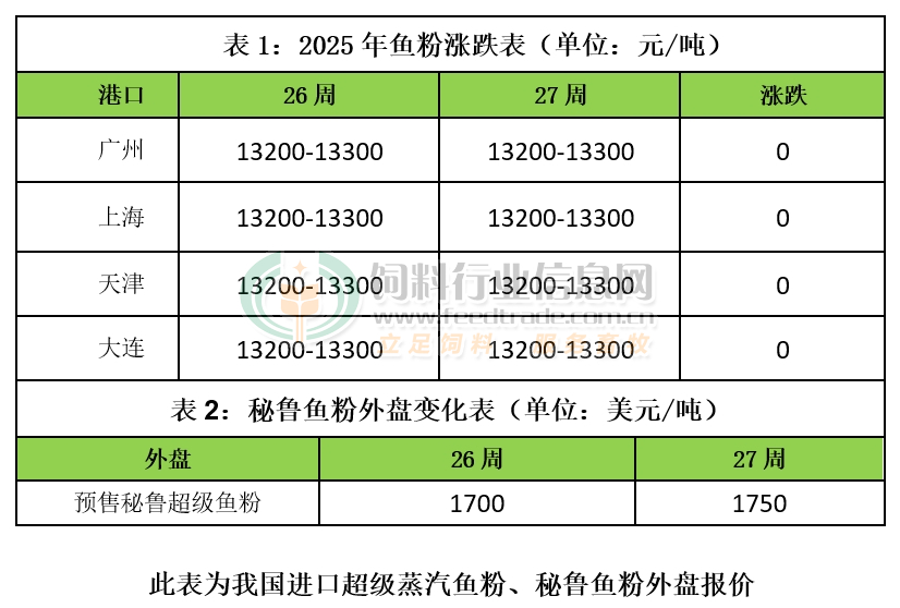 本周秘魯魚粉外盤價格上漲。近來秘魯中北部捕魚節奏放緩,且秘魯魚粉廠商預售魚粉良好,預售量至52萬噸左右,如此一來,可售魚粉量少,秘魯魚粉廠商心態堅挺。目前秘魯超級蒸汽魚粉本季預售報價CNF參考1750美元/噸,上漲50美元/噸,實際成交議價。捕魚方面, 2025年4月22日-6月30日秘魯中北部捕魚量共計2204791噸,剩余配額為795209噸,配額完成73.49%。