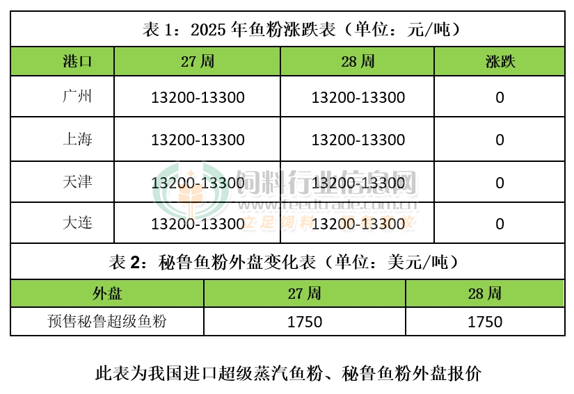 本周秘魯魚粉外盤保持堅挺持穩。由于秘魯本季魚粉預售量至52萬噸以上水平,本季可售魚粉量偏低,不少廠商不主動報價,當地市場成交一般。目前秘魯超級蒸汽魚粉本季預售報價CNF參考1750美元/噸,實際成交議價。捕魚方面,6月末漁民節日結束,但捕魚進度仍緩慢為主,據統計,2025年4月22日-7月6日秘魯中北部捕魚量共計2298920噸,配額完成76.63%。