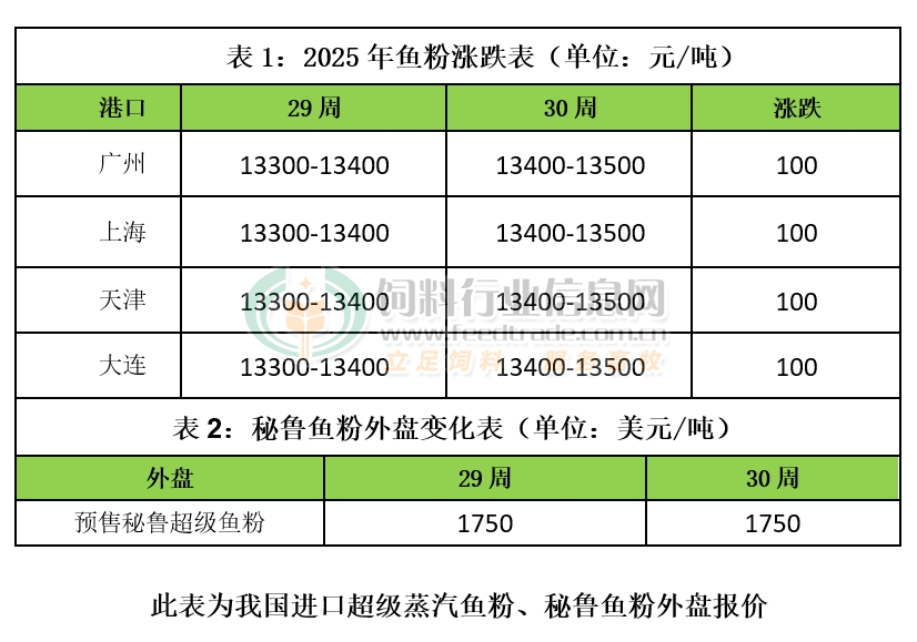 本周秘魯魚粉外盤價格穩定,秘魯超級蒸汽魚粉本季預售報價CNF參考1750美元/噸,實際成交議價。周內秘魯生產部N°00120-2025-PRODUCE號公告,2025年秘魯A季中北部捕魚自當地時間2025年7月23日零時正式結束。2025年4月22日-7月20日秘魯中北部捕魚配額完成80.87%,其他結構統計為至21日秘魯中北部捕魚量完成了81.4%。