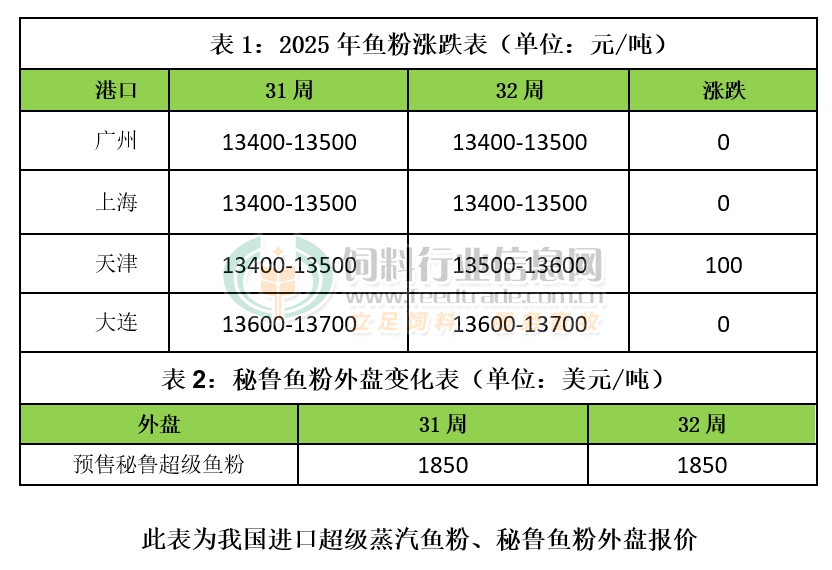 本周國內外魚粉高位有漲。外盤方面,新季預售魚粉高價,新季超級蒸汽魚粉預售參考價格為CNF1850美元/噸,但高價限制成交量。目前市場人士,開始關注秘魯下季魚資源考察動態。有消息顯示,秘魯下季鳀魚資源計數考察將在8月15日開始,隨后第二階段聲納學考察將在鳀魚資源計數考察結束后展開,預計在9月上旬左右。