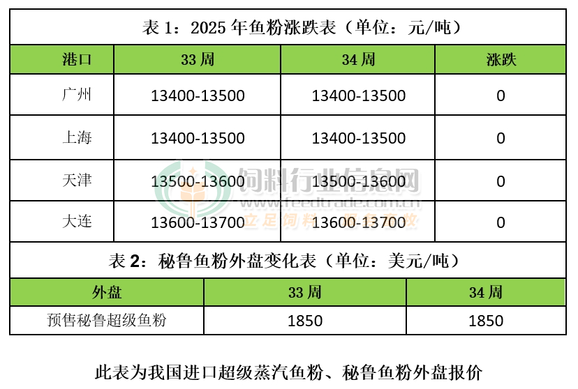 本周魚粉外盤方面堅挺持穩,國內外魚粉價格倒掛,制約我國魚粉采購商意愿,即便有廠商有意議價,但秘魯當地魚粉市場成交清淡。當前新季超級蒸汽魚粉預售參考價格為CNF1850美元/噸,實際成交議價。據悉8月中下旬秘魯新季鳀魚產卵計數考察已經展開,預計9月12日結束,9月10日秘魯將展開聲納學考察,或在10月中旬結束,根據考察情況,為新季漁資源考察計劃作參考。