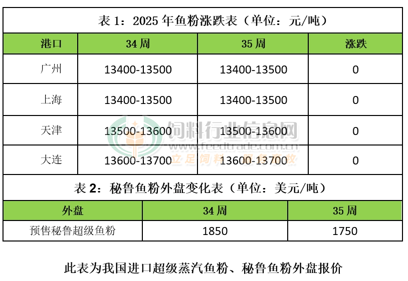 本周魚粉外盤方面,由于自秘魯新季外盤魚粉參考價格公開后,價格高企,限制市場成交。本周外盤價格有所下調,一些買家進行采購,市場成交有所增加。當前新季超級蒸汽魚粉預售參考價格為CNF1750美元/噸,跌100美元/噸,實際成交議價。捕魚方面,據統計,2025年7月1日-8月12日秘魯南部捕魚配額剩余22.06萬噸。