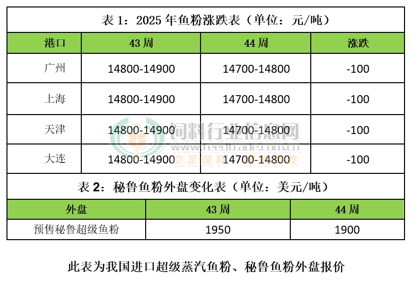 國內進口魚粉價格繼續小幅下跌。秘魯超級蒸汽魚粉價格集中在14700-14800元/噸,下跌100元/噸,實際成交議價。周內氣溫下降后,水產養殖需求下降,令港口魚粉出貨由上周日出貨4000噸左右,下降至3600噸左右,在加上外盤價格松動下跌,令部分魚粉持貨商心態受影響,報價有所下調。同時國產魚粉受影響,其中山東榮成地區63%蛋白TVN150的國產魚粉參考報價在12400元/噸,跌200元/噸。短期預計魚粉市場趨弱整理,等待政策消息給與指引。