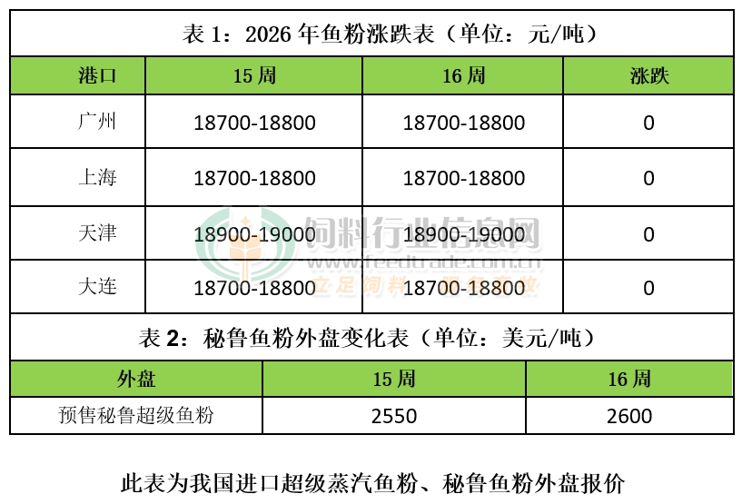 魚粉外盤方面,魚粉廠商保持挺價意愿,價格上調。新季秘魯超級蒸汽魚粉預售參考價格在CNF2600美元/噸,上漲了50美元/噸,同時成交有所放慢,魚粉預售量在16萬噸左右。目前市場關注捕魚進度,開捕初期為偏低量。據統計,2026年4月9日-14日捕魚量為165120噸,配額完成8.63%。