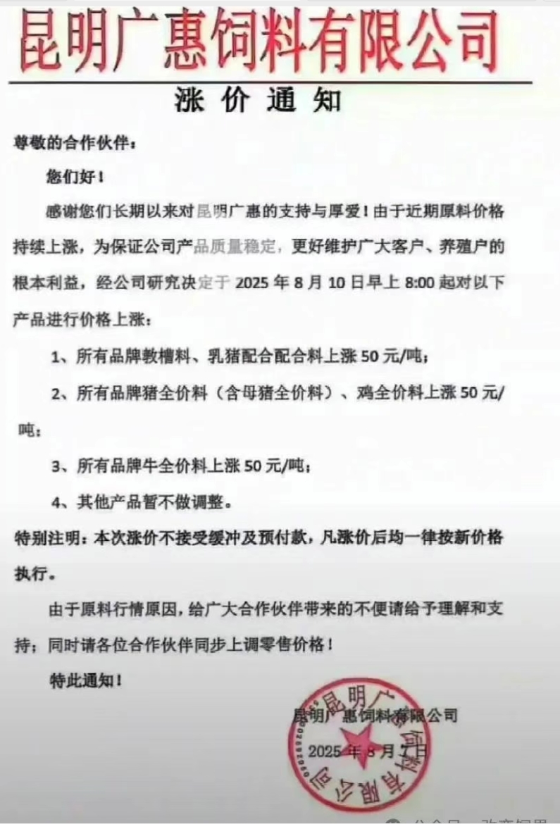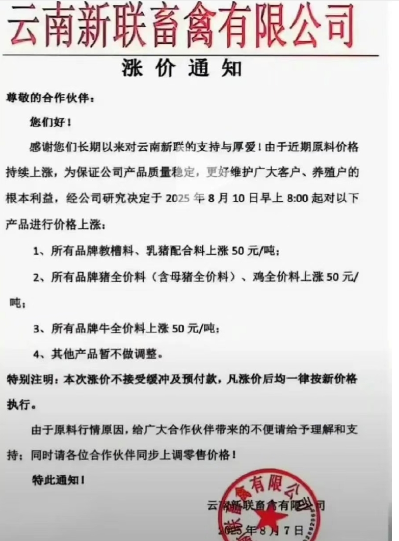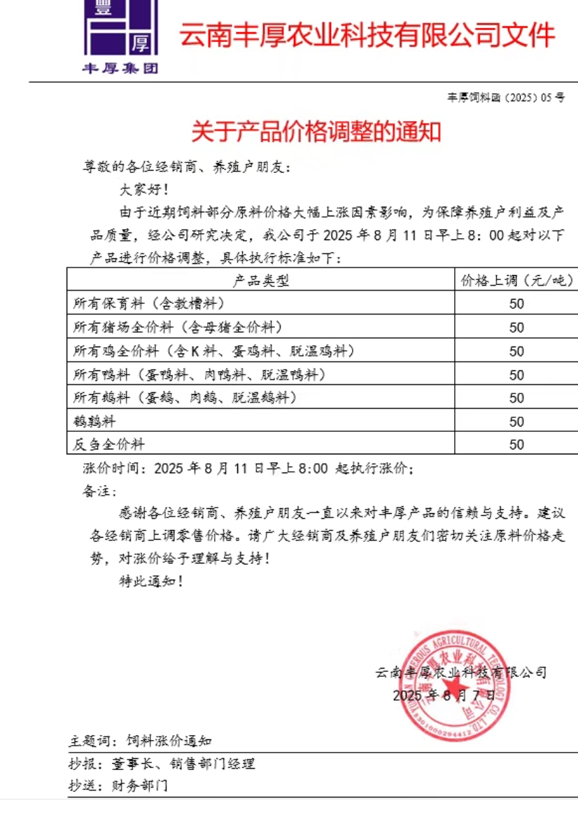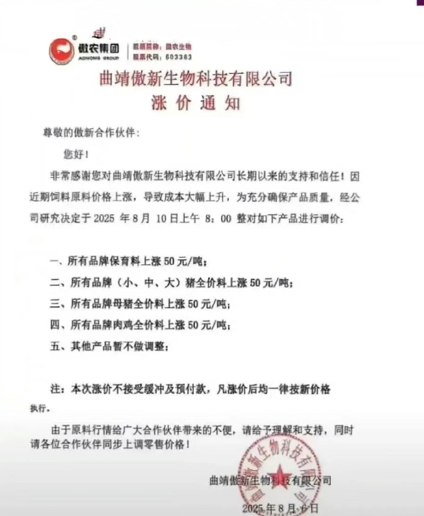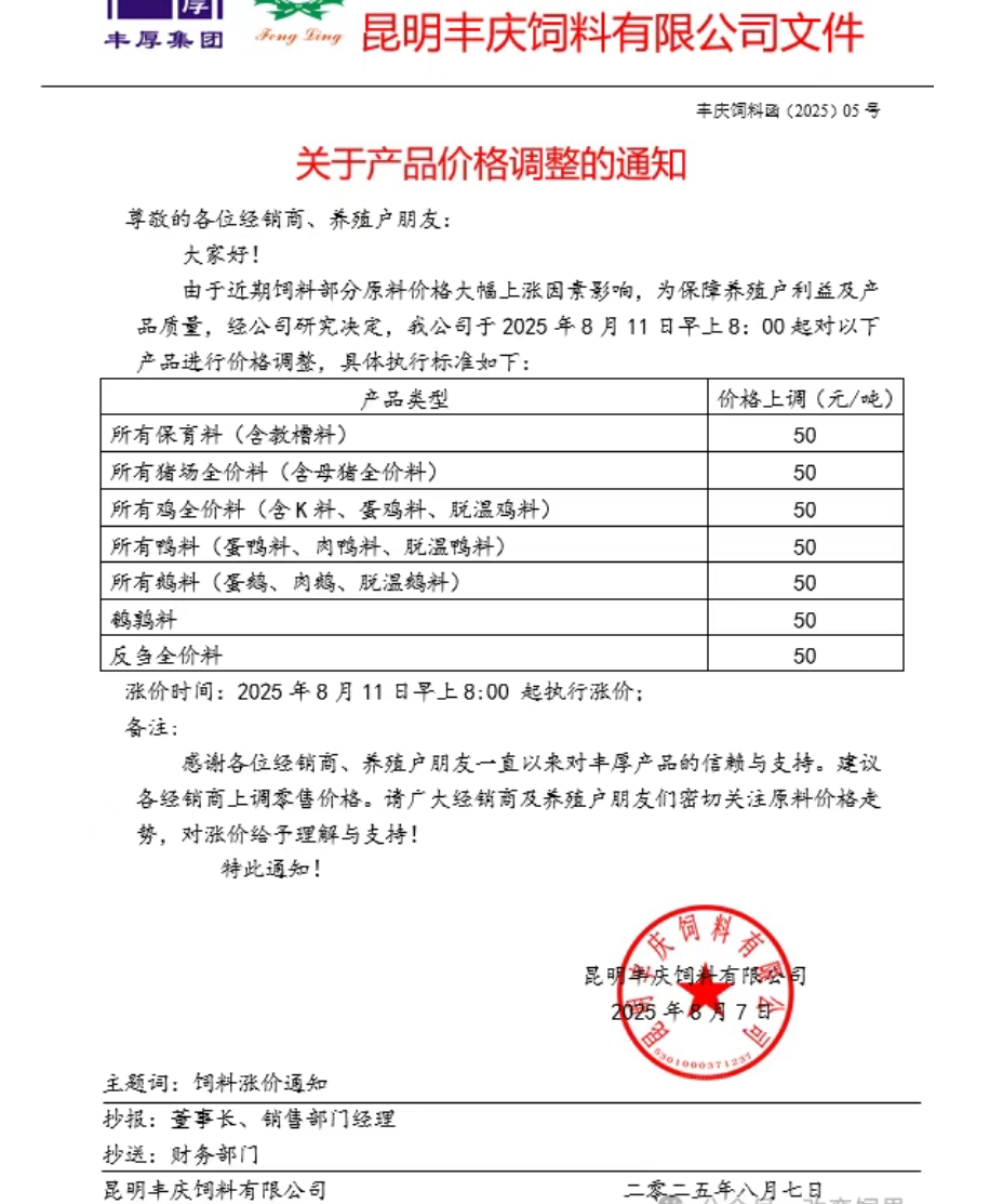 近日,多家飼料企業紛紛上調飼料價格,其中海大、安佑、大北農、傲農、新希望、滇大、特驅、漓源等多家發布調價通知,涉及豬料、禽料及反芻料等品類,漲幅集中在 50-100 元 / 噸。部分企業明確表示 “不接受緩沖或預付款”,漲價后立即執行新價。