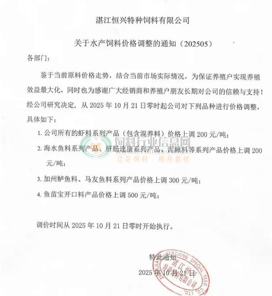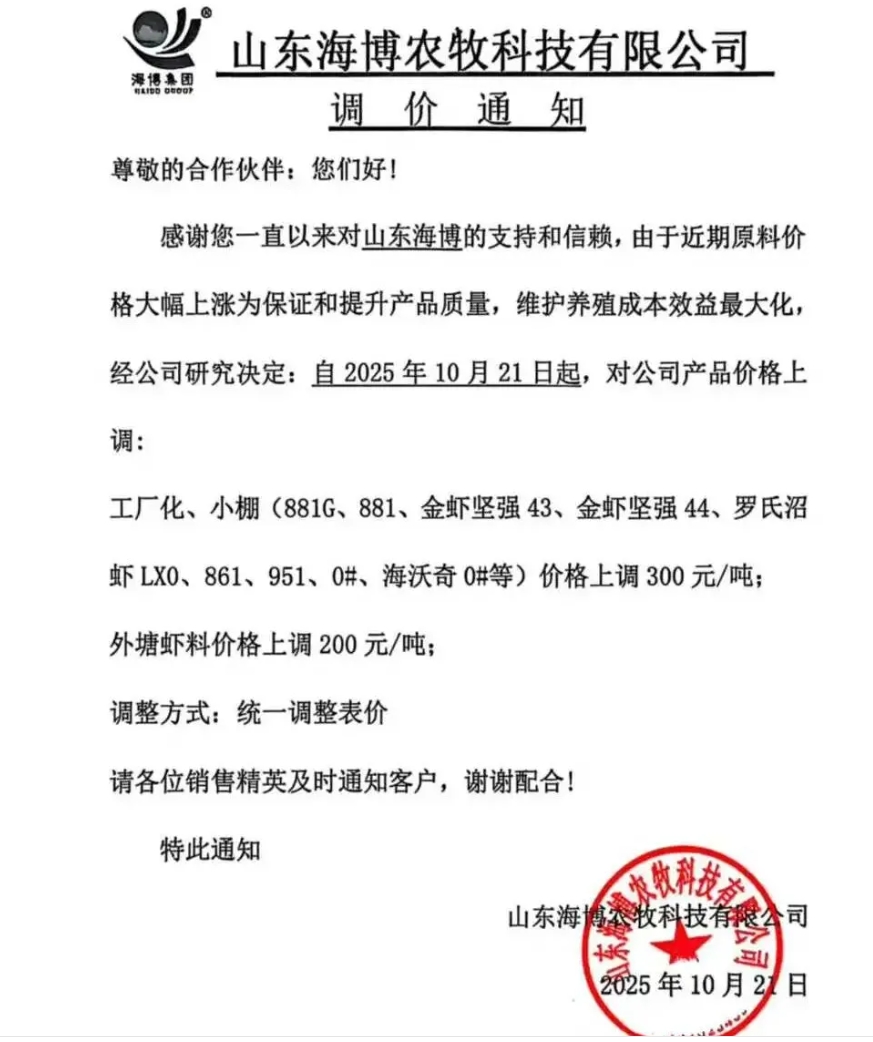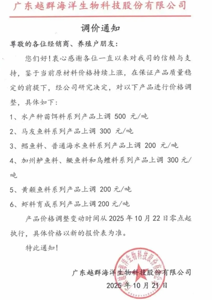 漲價的企業有,海大、通威、粵海、澳華、恒興、百洋、匯海、海博、德海、越群、海馬、金浦、傲農、普樂多、海恒、漁嘉、等以及眾多蛙料企業如源信、恒源、科綠、詠蛙、銘勝、和輝、福蛙、宏德、澄蓮、鴻益等。
