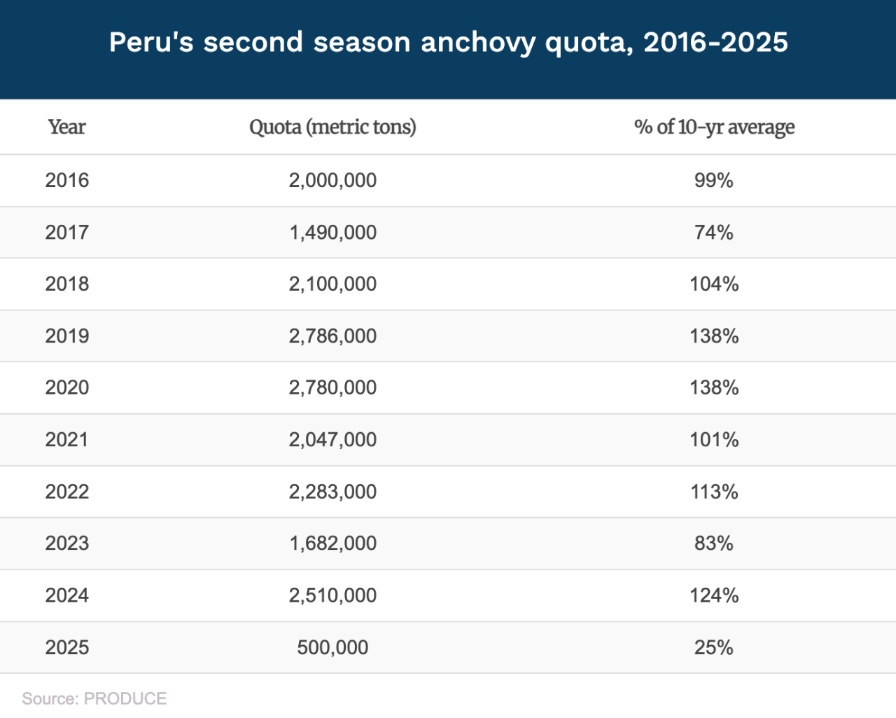 過去十年,秘魯鳀魚B季度平均配額在219萬噸,2019年高達279萬噸,2017年最低,僅有149萬噸。