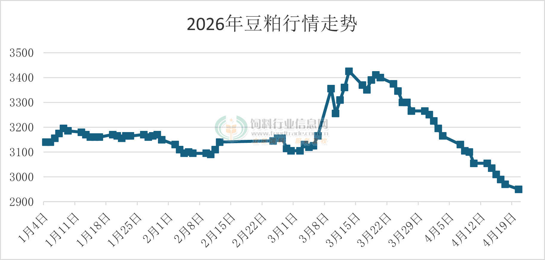 從3月中下旬豆粕保持持續下跌。是的今天豆粕價格繼續下跌,并且沒有止跌的意思。好一個連連叫慘,沒法扭轉。其中從3月19日下跌至今,均價累計下跌了460元/噸。