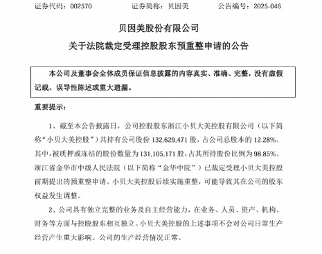 7月23日,貝因美發布公告指出,控股股東浙江小貝大美控股有限公司(以下簡稱“小貝大美控股”)于2025年7月16日向金華中院提交了預重整申請,金華中院已于2025年7月22日裁定受理該申請。小貝大美控股目前持有公司股份1.33億股,占公司總股本的12.28%,其中被質押或凍結的股份數量為1.31億股,占其所持股份比例為98.85%。此次重整可能導致其在公司的股東權益發生調整。