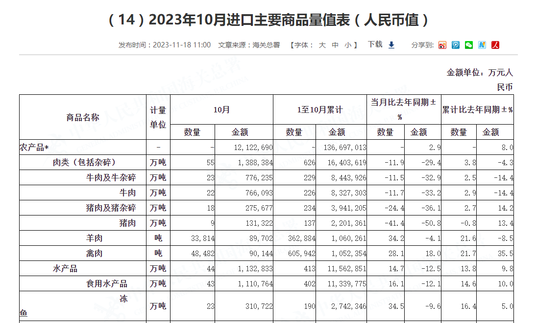 據海關總署發布最新數據統計顯示,2023年10月中國進口肉類(包含雜碎)為55萬噸,同比下滑12.7%;總進口金額為138.8億元,同比下滑29.5%。