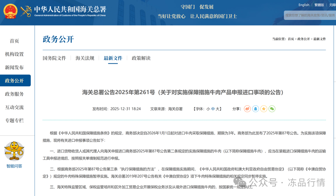 海關總署:關于牛肉進口申報以及26年關稅調整方案的公告