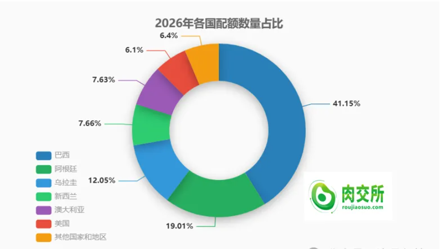 從國別配額分布來看:巴西以 110.6 萬噸(41.1%)成為最大配額國,阿根廷(51.1 萬噸,19.0%)、烏拉圭(32.4 萬噸,12.0%)緊隨其后,新西蘭、澳大利亞分別獲得 20.6 萬噸、20.5 萬噸配額,美國及其他地區瓜分剩余份額。業內普遍預測,主要國別配額大概率在 2026 年上半年就會用完。一旦觸發55%的附加關稅,持有訂單的貿易商將面臨兩難:要么承擔巨額稅負,要么寧愿損失定金選擇棄單。