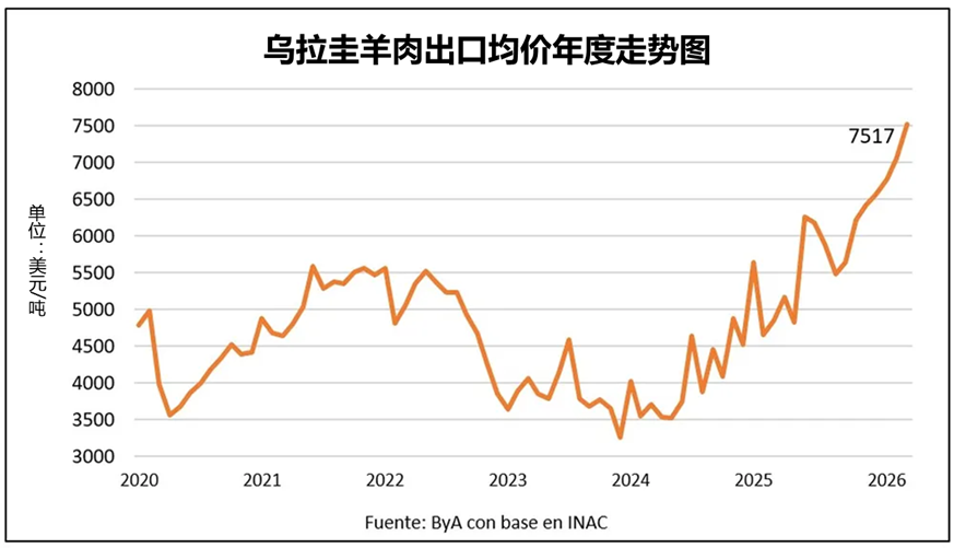 過去一周,出欄羔羊及出口羊肉噸價雙雙刷新歷史紀錄。烏拉圭國家肉類協會截至14日的統計顯示,過去八周出口羊肉價格持續上漲,累計漲幅達20%(每噸1300美元),過去30天均價達到每噸7517美元的歷史新高,同比上漲54%(去年同期為每噸4888美元)。與此同時,羔羊價格繼續飆升。