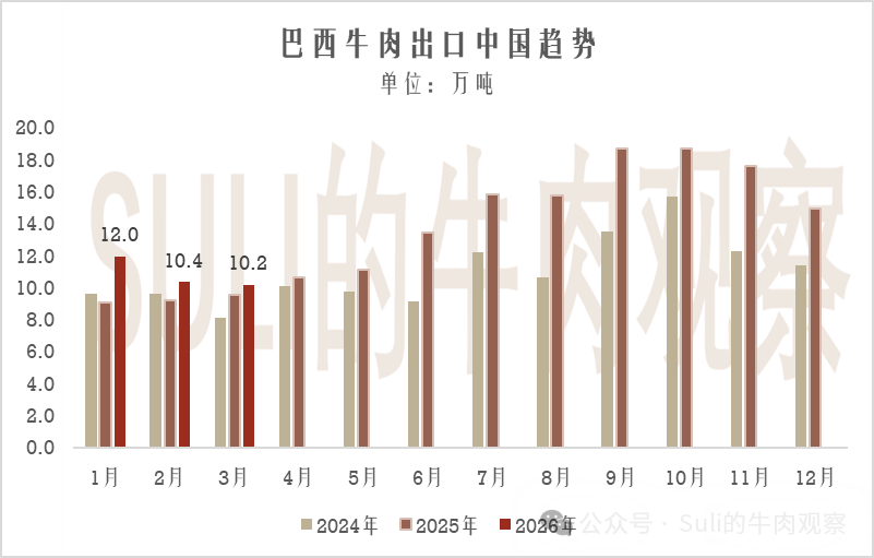 上一期說過,2026年1月之前在途以及積壓在中國港口的貨物如果在2026年才完成清關,那么也是消耗2026年的配額的。根據海關數據,2026年1月和2月我國共進口了巴西牛肉37.2萬噸。牛肉進口暴增,2026年牛肉配額快速消耗?