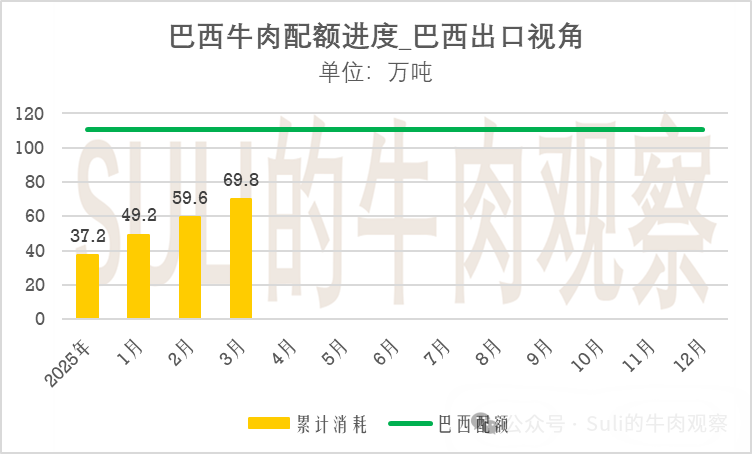 前三個月加起來的發貨量是32.5萬噸,再加上37.2萬噸(假設2025年的積壓數據是37.2萬噸),總量接近69.8萬噸(配額占比63%)。那么從4月開始,巴西宰配額內就只能再向中國出口40.8萬噸的牛肉了,超過的部分可能就要被加征關稅了。