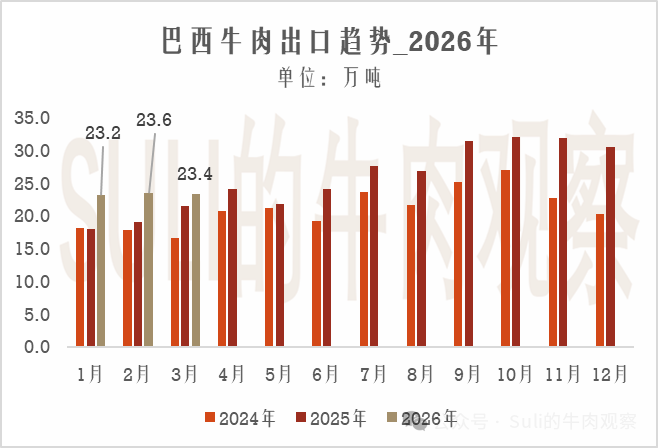 同比增長明顯,但出口節奏相對放緩2026年3月,巴西共出口23.4萬噸牛肉,同比去年增加了1.9萬噸,同比增幅是9%。環比上個月則減少了0.2萬噸,環比減少1%。