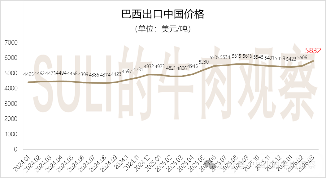 第一季度,巴西牛肉出口中國的均價逐月攀升,3月份達到5832美元/噸,和上個月相比上漲5.9%,也是2024年以來最高的出口均價。
