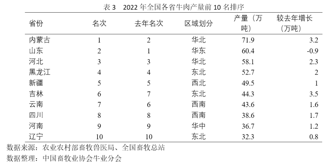 表3數據顯示,2022年全國牛肉產量前十名的?。▍^)保持不變,僅山東出現負增長,同比減少0.9萬噸。