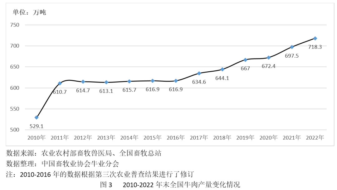2022年我國牛肉產量718萬噸,較2021年增加20.5萬噸(見圖3),同比增長2.8%,比2012年增長16.8%。