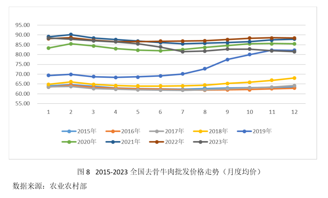 2023年國內牛肉市場行情進入下行通道,全年牛肉(去骨)批發均價約84.24元/kg,同比下降3.96%,月度牛肉價格跟隨活牛價格起伏而產生波動,且在12月份傳統消費旺季降到81.41元/kg,成為2019年11月份以來月度價格最低點,無獨有偶,2023年我國進口牛肉市場同樣“遇冷”,平均到岸價格5195美元/噸,同比下跌21%。導致當年牛肉行情下滑的原因主要包括四個方面:一是需求萎縮,消費不振。當前我國人口出現負增長,老齡化進程加快,國內牛肉傳統消費進入飽和階段,同時新的增長點也增長乏力,據國家統計局數據顯示,2023年12月,全國畜肉類價格下降15.9%,影響CPI(居民消費價格指數)下降約0.56個百分點,其中豬肉價格下降26.1%,影響CPI下降約0.43個百分點,對于牛肉價格下降發揮著傳導作用;二是供給相對過剩。2022年我國牛肉總產量超過700萬噸,比10年前增加了300多萬噸,加上進口的200多萬噸,總量超過900萬噸,在需求萎縮的時代背景下便呈現出供給相對過剩的局面,國內牛肉市場的“供強需弱”也是造成肉牛及牛肉行情下滑的主要原因之一;三是進口沖擊。隨著我國與雙邊、多邊國家政府自由貿易合作不斷強化,進口稅率逐步下調,致使涌入國內消費市場的進口牛肉低價優勢愈發凸顯;四是屠宰牛非自然性“增員”加劇?;钆J袌鲂星榈兔哉T發了繁育母牛被養殖者規模性棄養拋售宰殺、以肉計價的現象,與此同時,由于奶價持續走低,奶牛養殖戶虧損嚴重,也開始大批量淘汰奶母牛,進一步擴大了屠宰牛短期積蓄效應。
