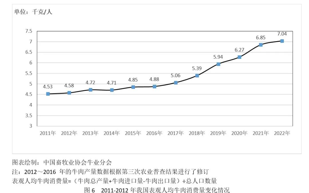 2022年我國表觀人均牛肉消費量為7.04千克/人,同比增長2.7%,比2012年增長53.7%。
