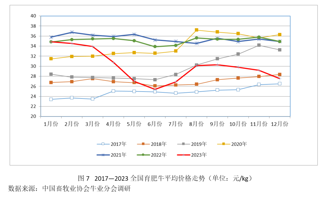 協會監測數據顯示,2023年全國育肥牛(西門塔爾牛雜交牛為主)全年均價為30.02元/kg,同比下跌16.9%,國內育肥牛2023年3月中旬開始出現持續性價格下跌,據不完全統計,2023年3~6月,東北地區大型肉牛屠宰企業“育肥牛收購價格”出現了史無前例的23連跌,2023年6月全國育肥牛平均價格約25.39元/kg,跌至2017年11月以來價格最低點。同期成年繁育母牛市場價格跌至16~24元/kg,與2020年相比,跌幅約達55%。價格大幅跌落導致養殖從業群體抗拒心理不斷加劇,短期內形成了群體性壓欄惜售的局面,造成活牛市場階段性供應短缺,7~8月份國內各地育肥牛行情陸續反彈,東北部地區8月末反彈上漲至30元/kg左右,逐漸傳導東北以外的肉牛主產區跟隨反彈,但是好景不長,9月份育肥牛行情再度出現下跌,12月份回落至27~28元/kg。