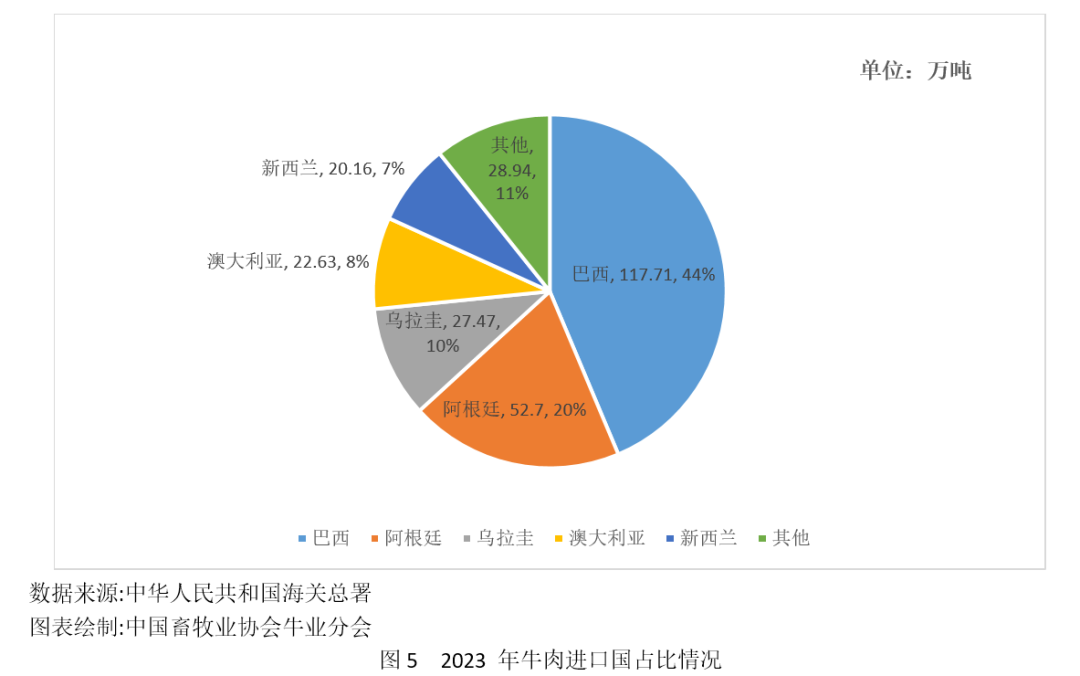 2023年,我國牛肉累計進口273.74萬噸,同比增加2%,進口主要來自巴西、阿根廷、烏拉圭、澳大利亞及新西蘭,其中從巴西進口117.71萬噸,占比43%;從阿根廷進口52.70萬噸,占比19%,從烏拉圭進口27.47萬噸,占比10%;從澳大利亞進口22.63萬噸,占比8%;從新西蘭進口20.61萬噸,占比7%;其余從美國、加拿大及智利等國家進口。