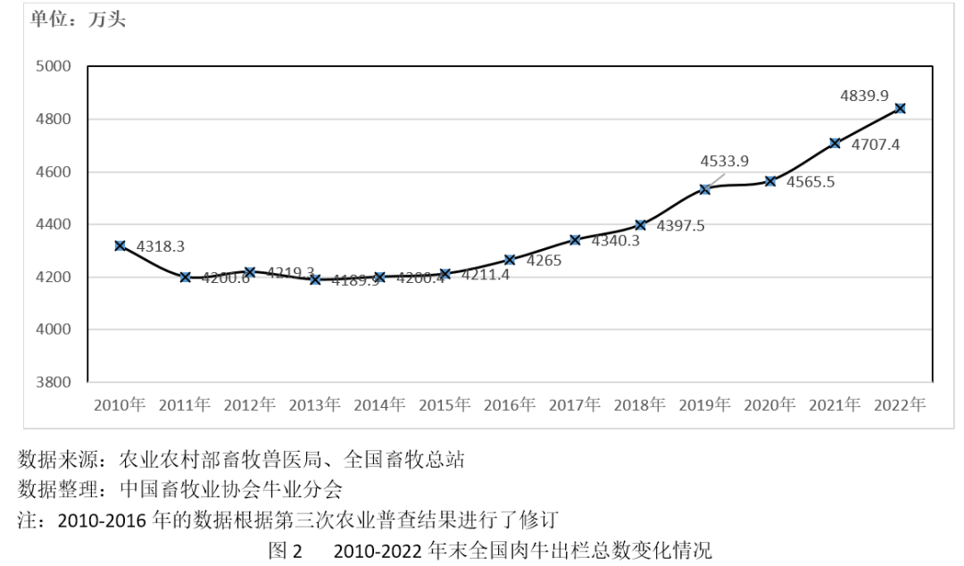 2022年我國牛肉出欄量4839.9萬頭,較2021年增加132.5萬頭(見圖2),同比增長2.8%,比2012年增長14.7%。