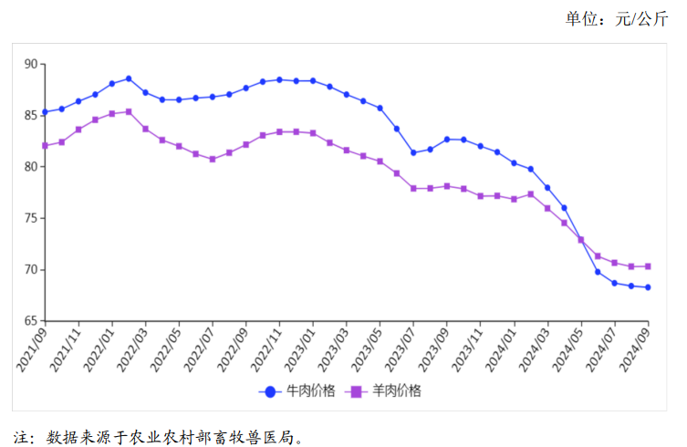9月份,牛肉價格環比小幅下跌,羊肉價格環比持平。隨著出欄季到來,市場牛羊肉交易旺盛,牛肉價格繼續下跌,羊肉價格維持穩定,活畜價格環比小幅上漲,尤其是活牛價格。