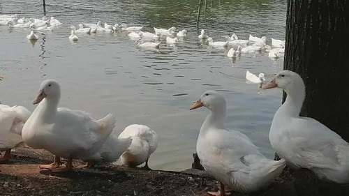白肉鴨入場后是否需要進育雛棚。要看是否扎堆,當出現岸上扎堆的情況時,就得趕到棚內,棚內保持25-30℃,由于他們太喜歡玩水了,所以在棚內不用喂料。