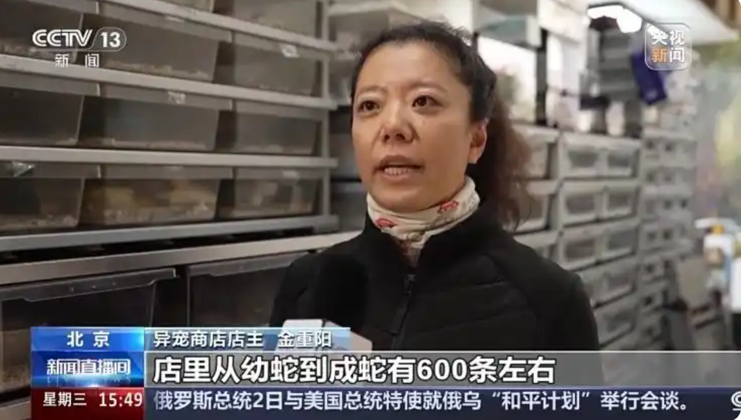 異寵商店店主 金重陽:店里從幼蛇到成蛇有600條左右,其中牛蛇體形特別大,可以長到兩米七到三米左右。它需要一個更大的空間,所以大家要是想養蛇的話一定要做好心理準備,給它們一個合適的空間、合適的溫度。