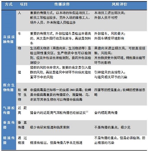 非瘟主要的傳播方式是直接接觸傳播,也存在媒介生物、氣溶膠、垂直傳播和精液傳播等傳播。臨床中這些傳播方式的主要特點如下表所示。