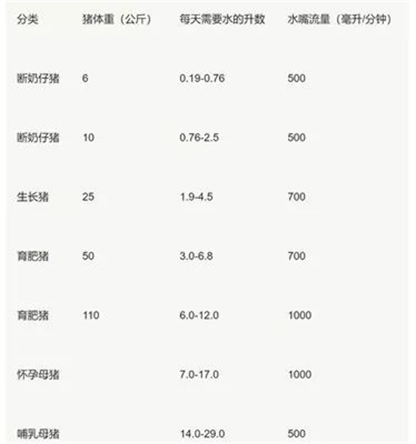 豬的日齡、階段、氣溫變化以及飼料類型都會對豬群的飲水量產生影響,通常計算豬的飲水量需要通過采食量進行換算,一般豬飲水量和采食量的比例為2.5-3,而豬的采食量又可以根據體重換算,保育豬的采食量為體重的4-5%,育肥豬的采食量為體重的3-4%,所以正常情況下豬每天的飲水量為體重的10-15%,但因為哺乳母豬需要提供奶水所以飲水量更大,可達到20kg/天甚至更高,具體各日齡的飲水量可參考下表: