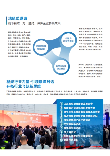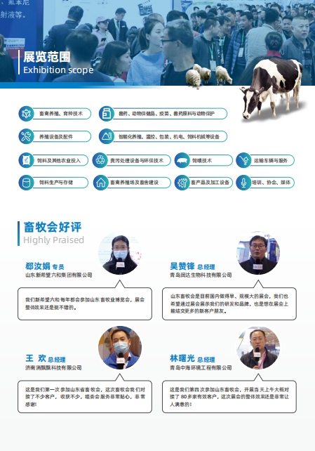 本屆畜博會規劃展覽面積近5萬平方米,使用4個室內展館。規模與品質并重,服務與內涵同步升級。本屆山東畜博會在展區規劃、重點展示、配套會議、展會服務等多方面進一步創新,促進展商、觀眾精準對接,提供更加便捷、舒適的參展體驗。同期舉辦山東畜牧業高質量發展大會、第10屆山東智能養殖裝備展、2024山東優質農畜產品展暨農畜產品千商采購節、畜禽糞污資源化利用及病死畜禽無害化處理論壇等重量級會議,以及技術講座、發布會、培訓會、活動日等,更有網紅直播、網絡帶貨、大咖專訪等形式多樣的交流互動。