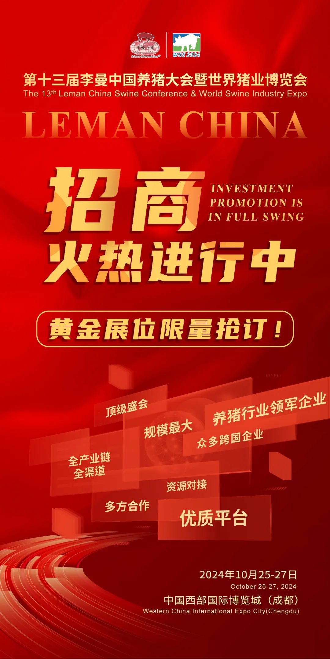 第十三屆李曼中國養豬大會暨世界豬業博覽會招商工作已經全面啟動,展位預訂火熱進行中,展位有限,預訂從速。屆時,熱烈歡迎國內外養豬業及相關企業、事業單位、科研院校、機構組織及各界人士撥冗蒞臨!2024年10月,讓我們相約成都,共聚全球養豬盛會,共同擘畫豬業高質量發展新藍圖!咨詢電話:010-62928860