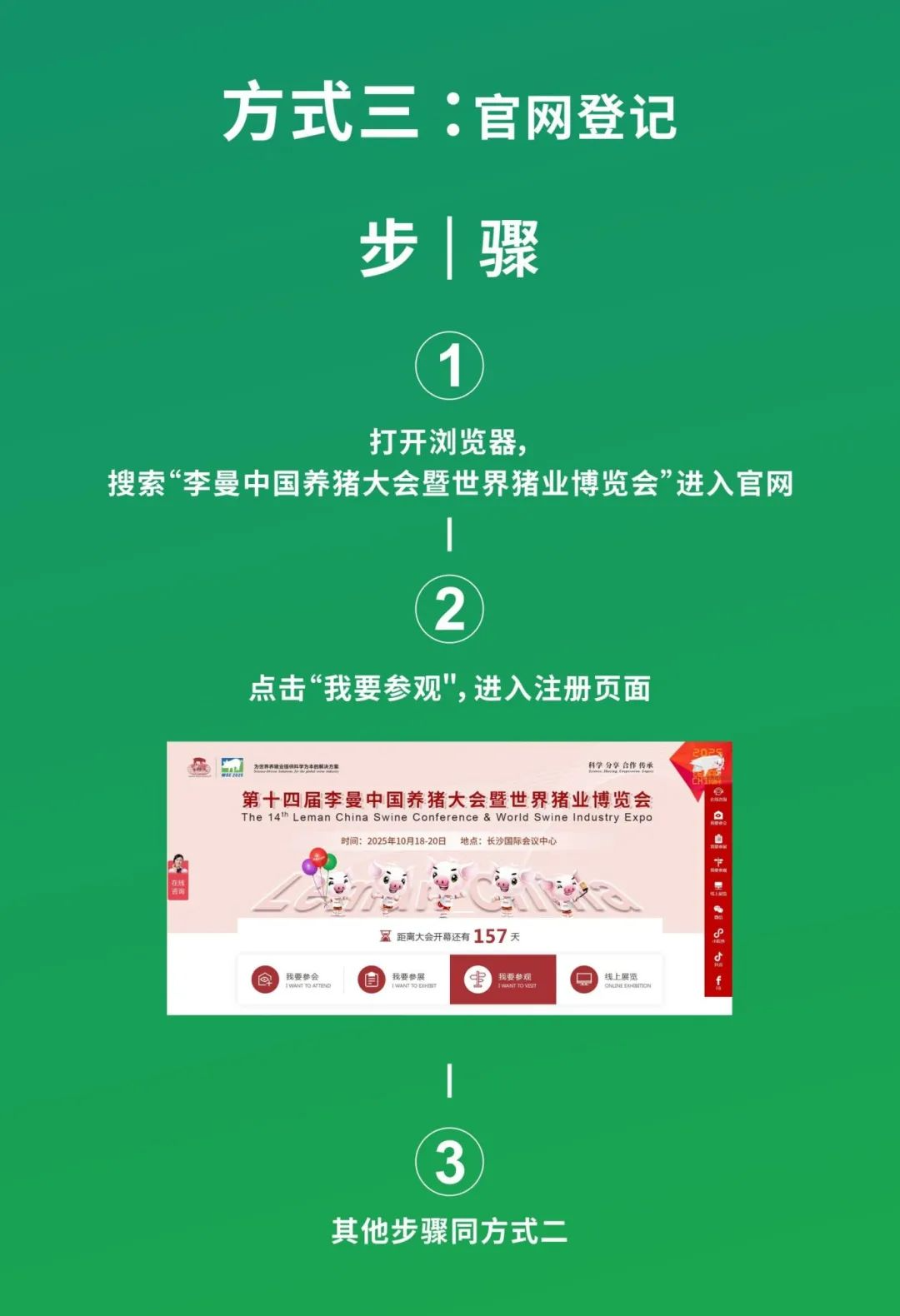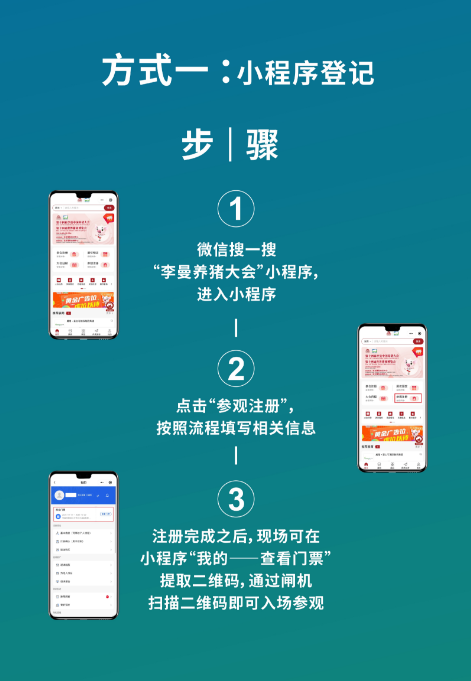 官方微信小程序:微信小程序搜索“李曼養豬大會”,首頁點擊“參觀注冊”按鈕,注冊完成之后根據流程填寫相關信息,現場可在小程序“我的”--“查看門票”提取二維碼,通過閘機掃描二維碼即可入場參觀。