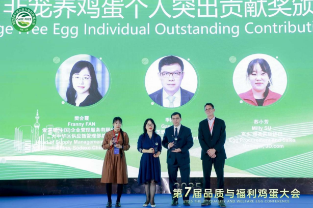 In advancing the “cage-free” concept and driving industry transformation, individual leadership has played a vital role. The 2025 Cage-Free Egg Outstanding Individual Contribution Award was presented to Franny Fan, Supply Chain Director of Sodexo China; George Gi, Procurement Director of Accor Hotels; and Xiaofang Su, Egg Category Manager at JD.com. With their foresight and practical actions, they have opened new paths for promoting the cage-free movement and set benchmarks for the industry, recognized for their exceptional contributions to animal welfare and the cage-free sector.