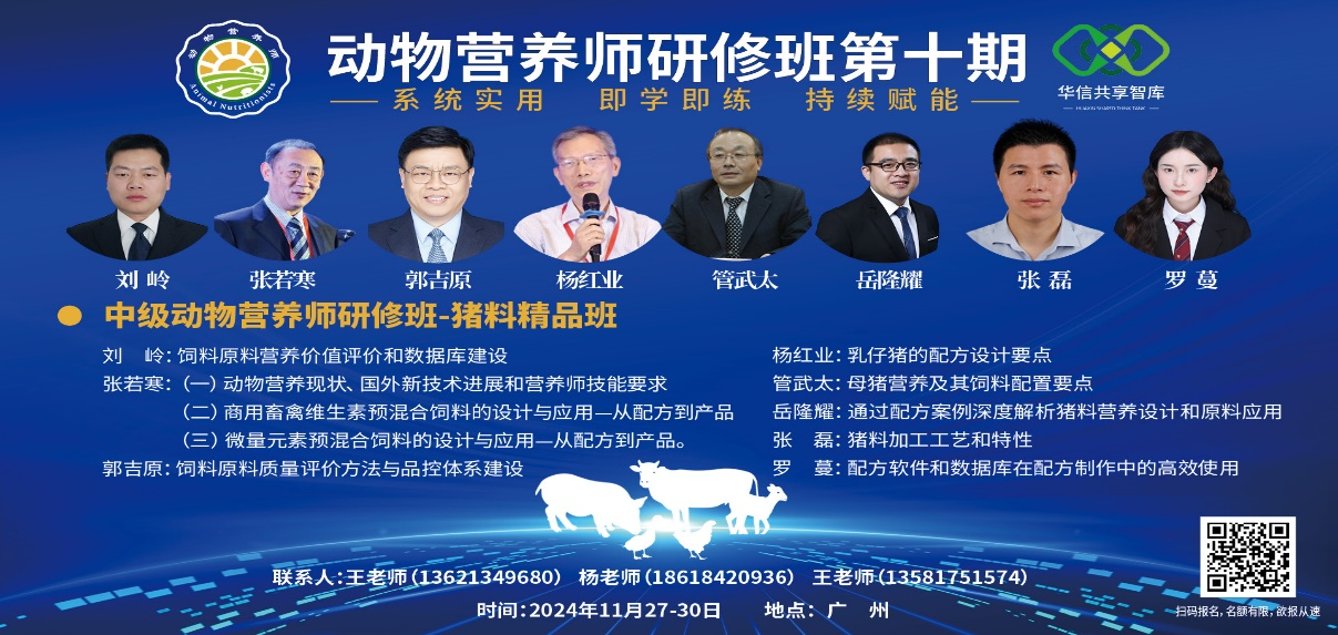 2024年11月27-30日,華信共享智庫將在廣州舉辦動物營養師研修班第十期,以下是課程安排,歡迎來自全國各地的行業同仁共赴廣州學習交流!
